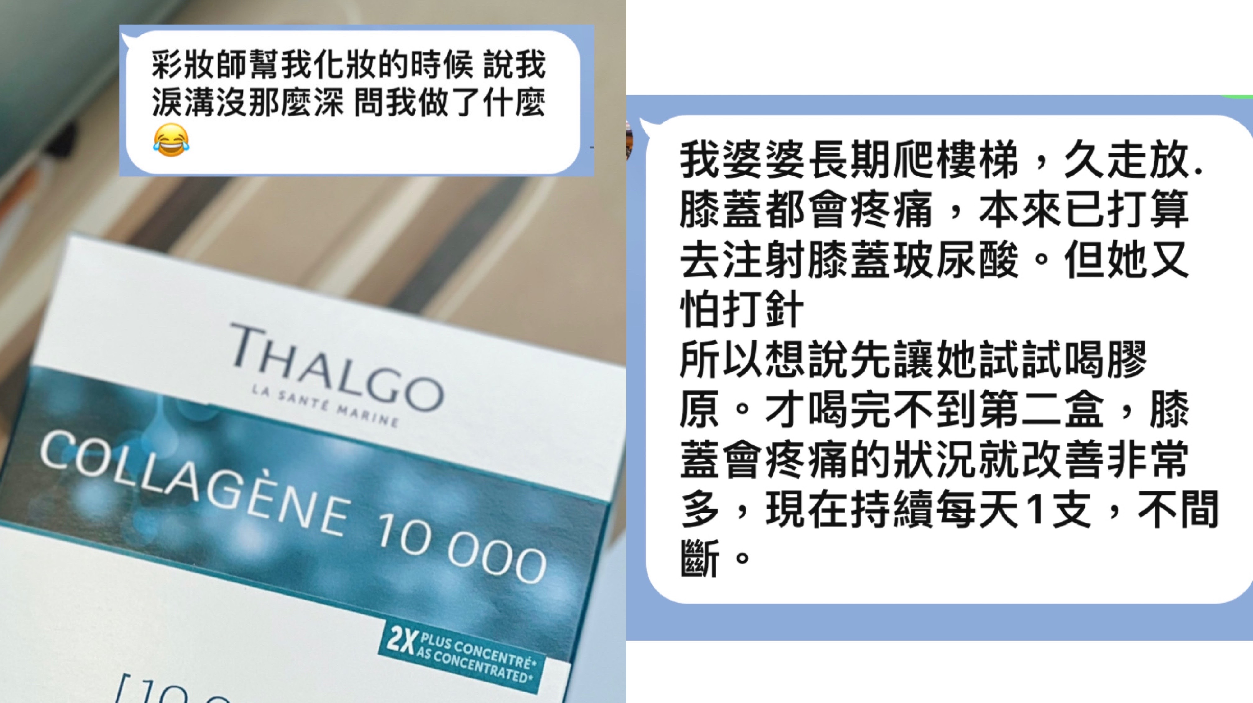 ▸ 「我婆婆長期爬樓梯,膝蓋都會疼痛,本來打算著色玻尿酸,試試膠原,喝不到第2盒膝蓋會疼痛的狀況改善非常多,現在持續每天1支不間斷。」