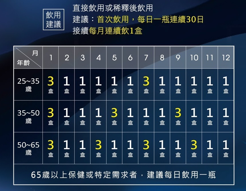 建議早上起床空腹飲用,吸收效果最好,依照年齡及需求補充,至少要連續一個月飲用最有感。