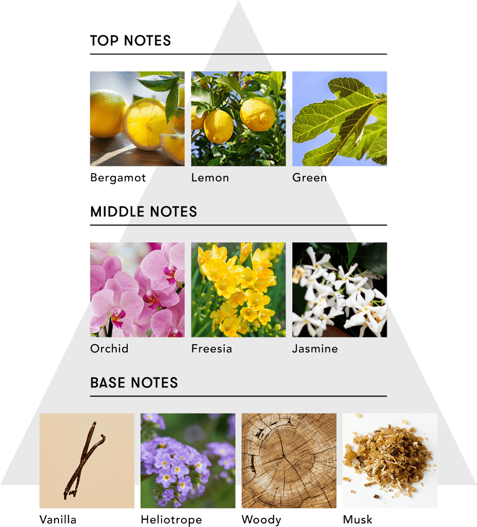 前調融合了佛手柑和檸檬的清新氣息,並以綠意點綴,令人精神振奮。中調展現了蘭花、小蒼蘭和茉莉的馥鬱花香,最後以香草、木質香調和麝香的柔和氣息收尾。
